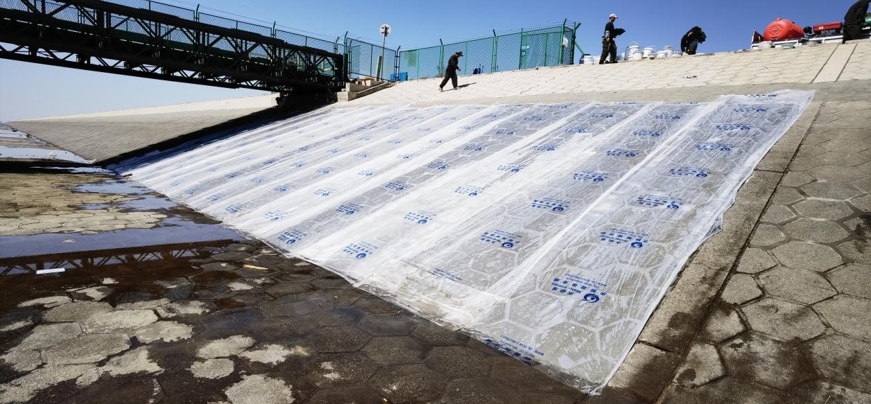 混凝土節(jié)水保濕養(yǎng)護(hù)膜,是以新型可控高分子吸水材料為核心,以塑料薄膜為載體,通過設(shè)備加工復(fù)合而成的卷材產(chǎn)品。其中高分子材料可吸收自重200倍的水分子, 吸水膨脹后變成透明的晶狀體,把液態(tài)水變成固態(tài)水,每平方米養(yǎng)護(hù)膜可蓄水0.5KG,成為一個(gè)固態(tài)的微型水庫(kù),然后通過毛細(xì)管的作用向混凝土養(yǎng)護(hù)面滲透, 同時(shí)不斷吸收混凝土在水化過程中產(chǎn)生的蒸發(fā)水,因此在一個(gè)養(yǎng)護(hù)期內(nèi)總能保持混凝土表面濕潤(rùn)。